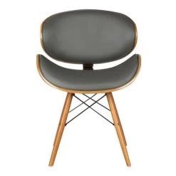 Add a touch of retro to your home with this elegantly designed Mid-Century modern chair. This dining chair piece features a softly curved back and seating made with hardwood framing in Walnut finish. Upholstered in faux leather and cushions designed to wrap you in comfort. The Eiffel leg supports and tapered walnut wood legs add clean lines and class to this mid-century design. Available in Black or Gray Pu upholstery.