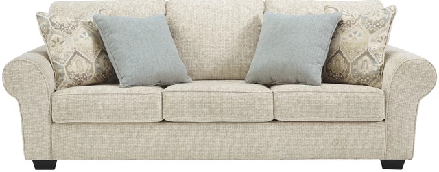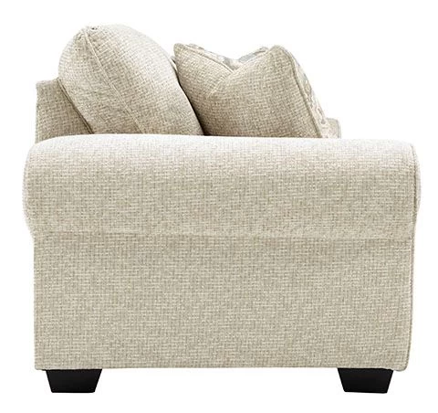 Frame constructions have been rigorously tested to simulate the home and transportation environments for improved durability. Frame components are secured with combinations of glue, blocks, interlocking panels and staples. Seats and back spring rails are cut from mixed hardwood and engineered lumber. Stripes and patterns are match cut. All fabrics are pre-approved for wearability and durability against AHFA standards. Cushions are constructed of low melt fiber wrapped over high quality foam. Constructed with a platform seat foundation. Toss Pillows with Welts.
