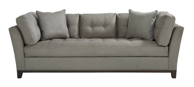 Decorative wood base that includes a tongue & groove metal hinge connection. Tuffted cushions without buttons that give eye appeal