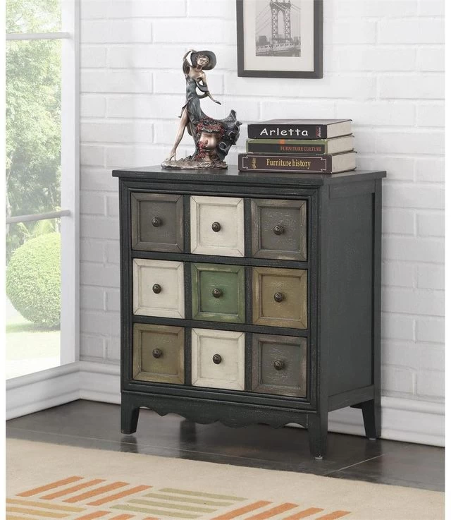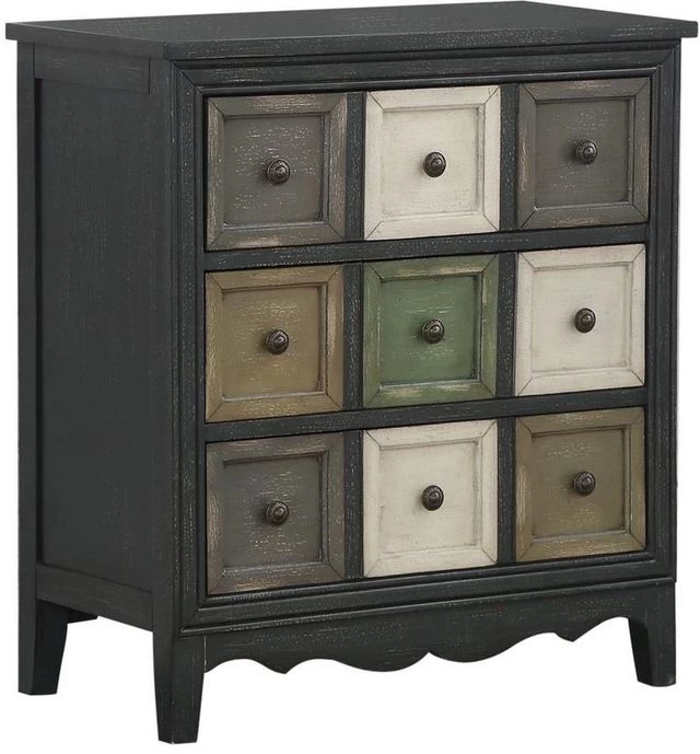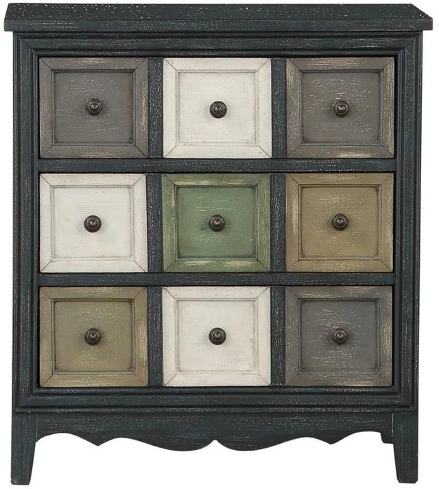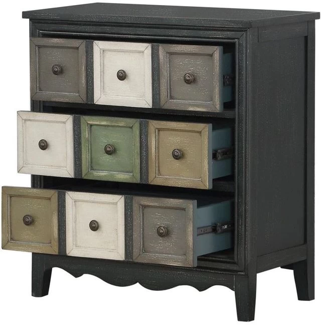 The apothecary styled drawer fronts add pops of muted colors and a nine drawer look to our Three Drawer Chest. Finished in a handsome Bakersfield Multi Color with grooved picture frame detailing around the front and a curved apron below, this charming chest has the added bonus of AC and USB ports conveniently placed on the back.