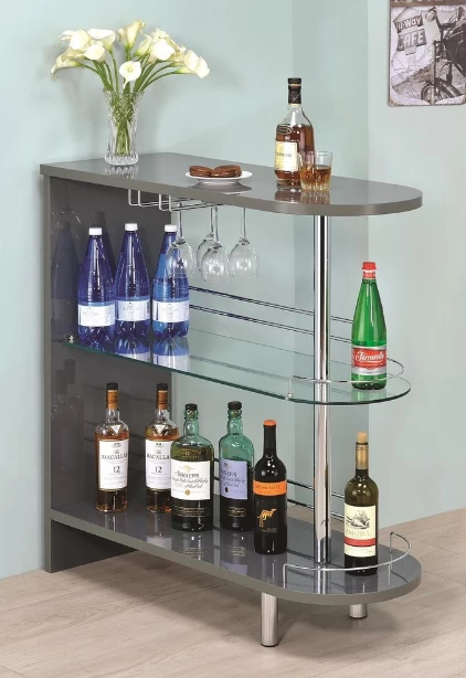Storage features include two (2) tiers of shelving, including one (1) glass shelf with guardrails, and stemware racks
