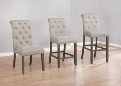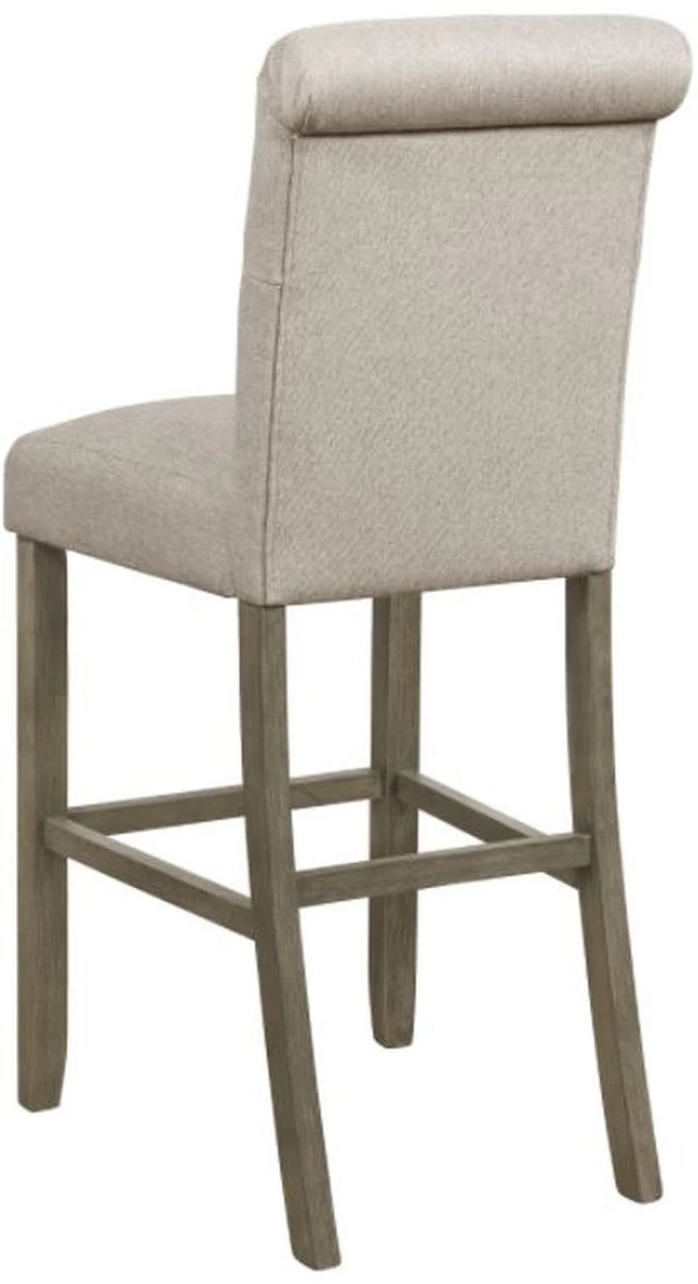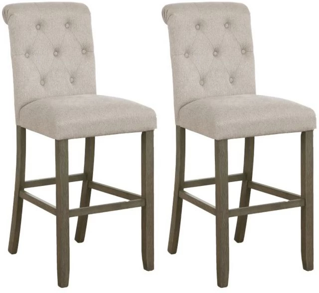 This set of two traditional stools offer a striking color combination. Its upholstered seat is wrapped in a linen-like fabric, offered in two color combinations. On the seat are classic button tufted details and a tall backrest with a rolled top. The upholstered seat is supported by a wooden frame, complete with a rustic brown finish that lends a country charm. The straight, squared legs offer extra support, as well as a foot brace for added stability.