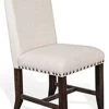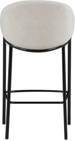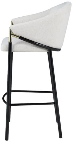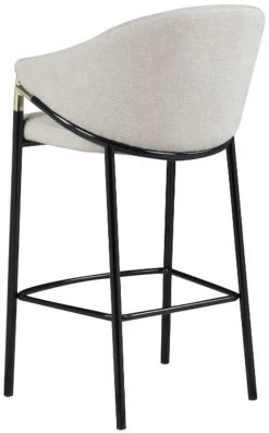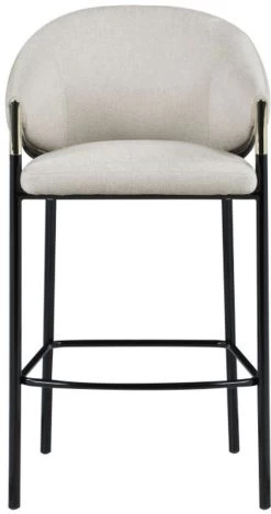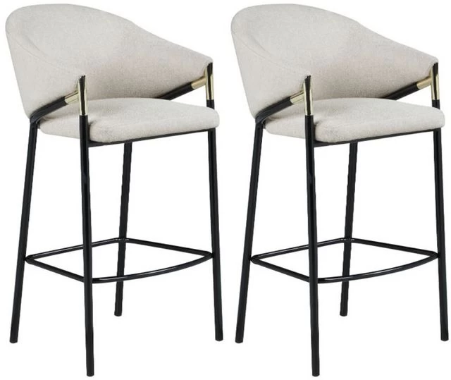 This pair of two stools offer a Hollywood regency look. With a tall and sleek design, the legs come in a glossy black finish that lends to many color palettes and offers a handsome look. Each stool has a cushioned seat, wrapped in a linen-like fabric that is soft to the touch. Plus, lean back and relax between sloped arm rests and a curved high back as you sip cocktails and chat with guests. Capping each arm rest is a gold accented piece that adds a glamorous touch.