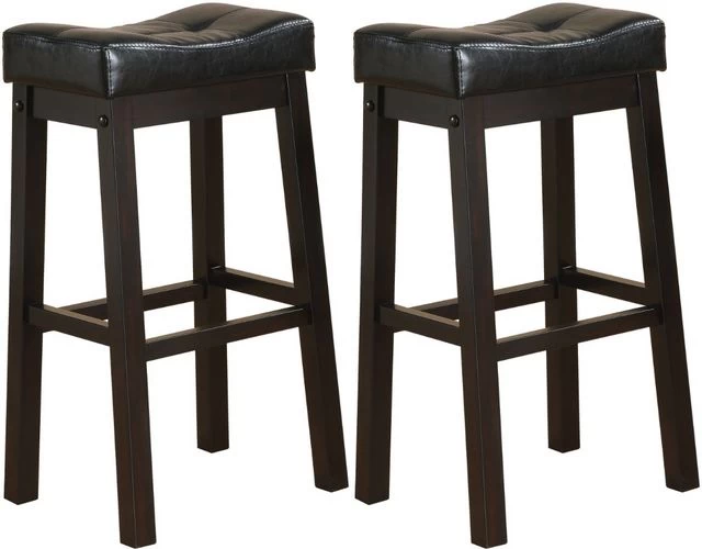 Its curved seat boasts black leatherette upholstery with tufting. Easy to maintain, this stool includes a wood base with angled legs and a rich cappuccino finish. Built-in footrests complement either side of the barstool, perfect for a relaxed evening or catching up on the news of the day.