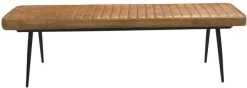 Pull up this long upholstered bench seating to a dining table or place at the foot of a bed. Perfect for an industrial style loft apartment or modern farmhouse home, this bench offers padded cushion for complete comfort and support. The foam-filled bench cushion even lends a vintage, boho-chic charm with a hand dyed goat leather fabric in a warm camel of dark espresso hues and a channel tufted design. Each end of the bench is supported by tapered and flared metal legs in a deep black finish. This bench is part of the Misty collection, which also offers matching chairs, as well as a coordinating dining table and server.
