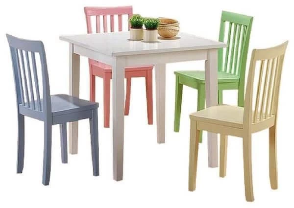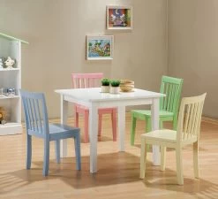 Four chairs in a medley of colors (charming pink, mint green, baby blue, and rich cream) will help make this the table so popular that kids from all over the neighborhood will be lining up to make reservations. This precious set will quickly become an endearing pleasure for your child.