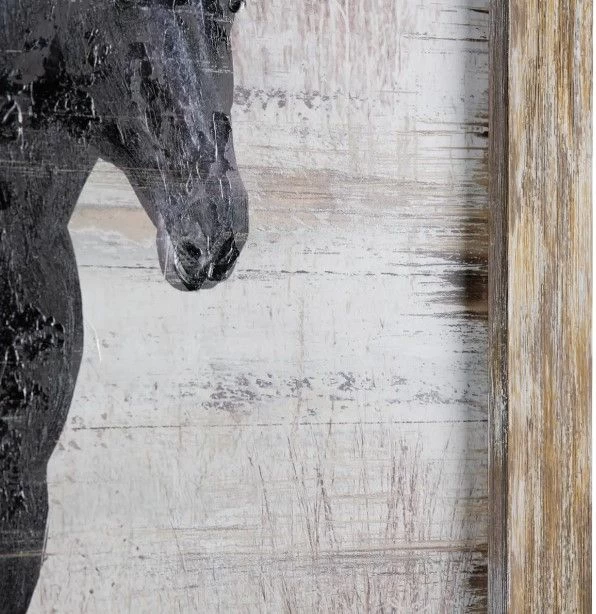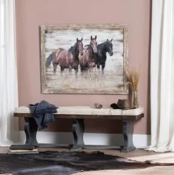 The warm color scheme of browns and whites adds a touch of comfort and coziness to the artwork, making it a perfect fit for any rustic or farmhouse decor. The painting perfectly captures the natural beauty of the horses and their surroundings, with every brushstroke capturing the essence of the great outdoors. The painting is expertly framed in a rustic and weathered wooden frame, adding a touch of authenticity and enhancing the natural feel of the artwork.