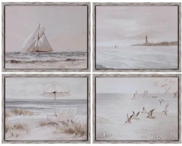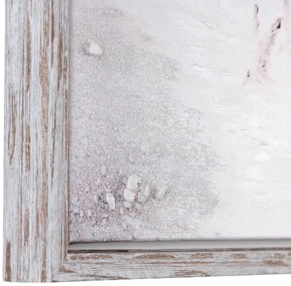 The paintings are rendered in a neutral color scheme of tan and white, creating a calming and peaceful effect that is perfect for creating a relaxing atmosphere in any space. The hand-painted textures and embellishments add a tactile quality to the artwork, bringing the scenes to life in a unique and captivating way. To add an extra touch of warmth and authenticity, the paintings are finished off in a natural brown wooden frame with a white wash overlay. The combination of the wooden frame and the neutral color scheme of the paintings creates a truly harmonious and organic effect that will complement any decor style.