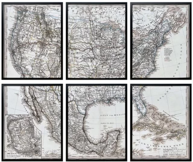 Set of 6 canvas paintings on the USA map with black gallery frame