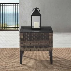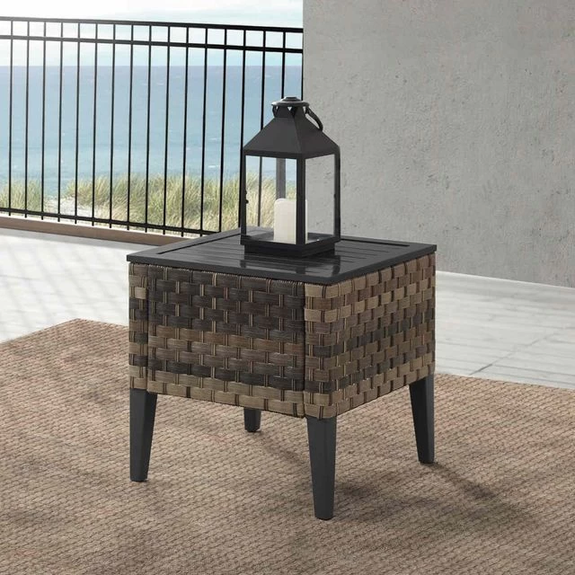 Handwoven multi-tone brown resin wicker with a weathered natural texture