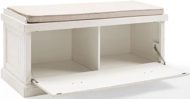 Hinged drop-down cabinet door on the bench