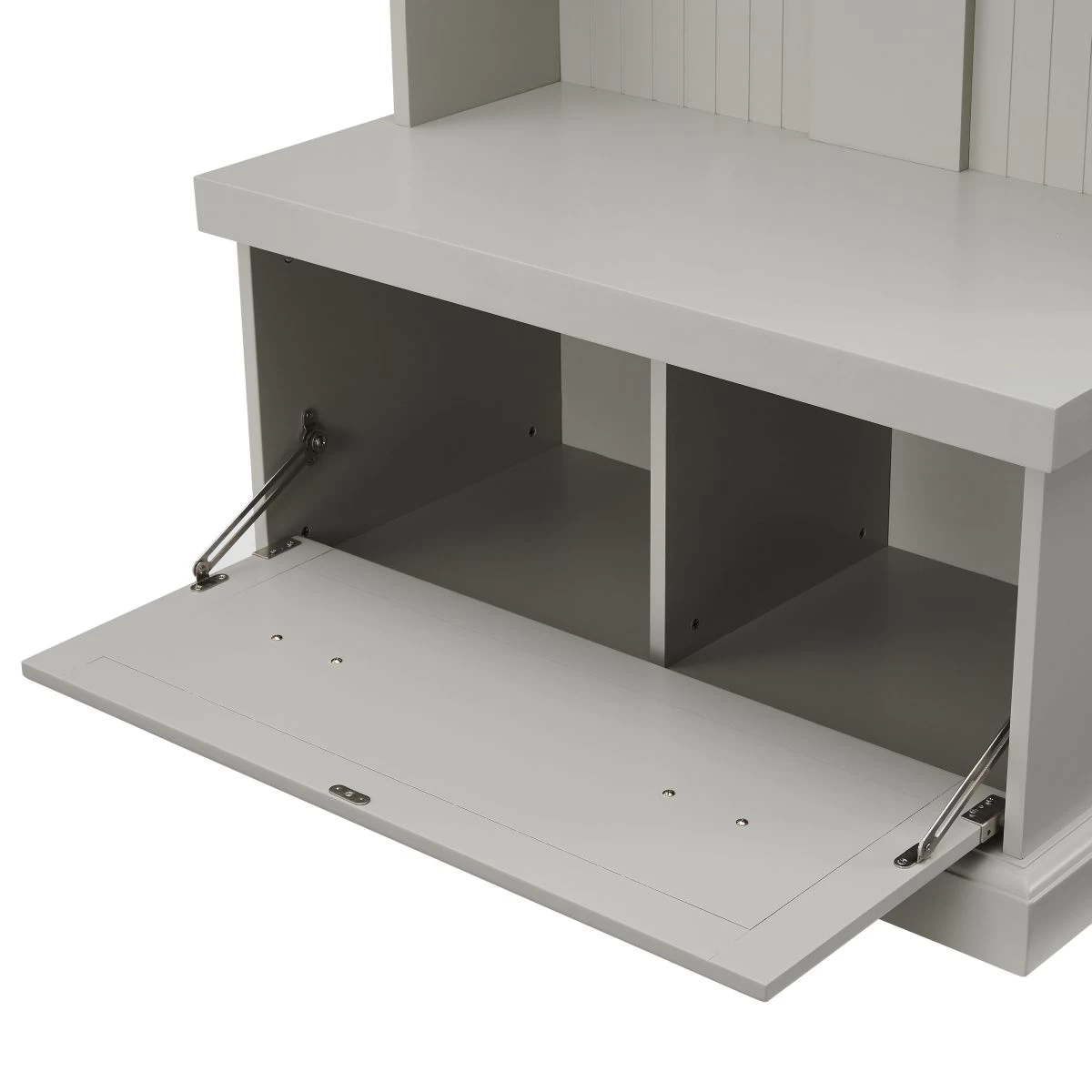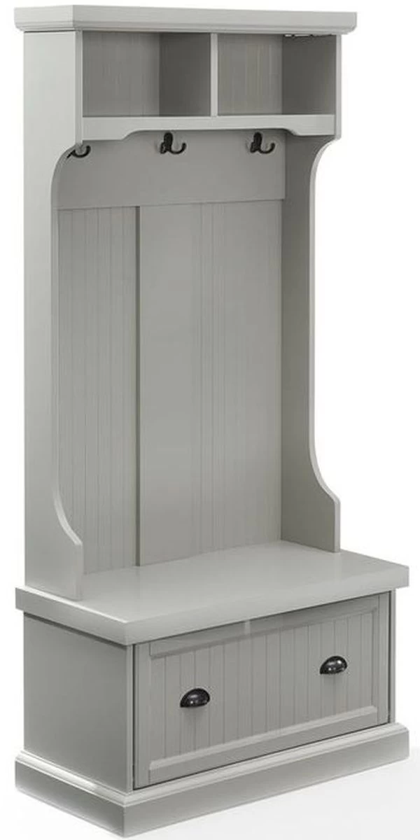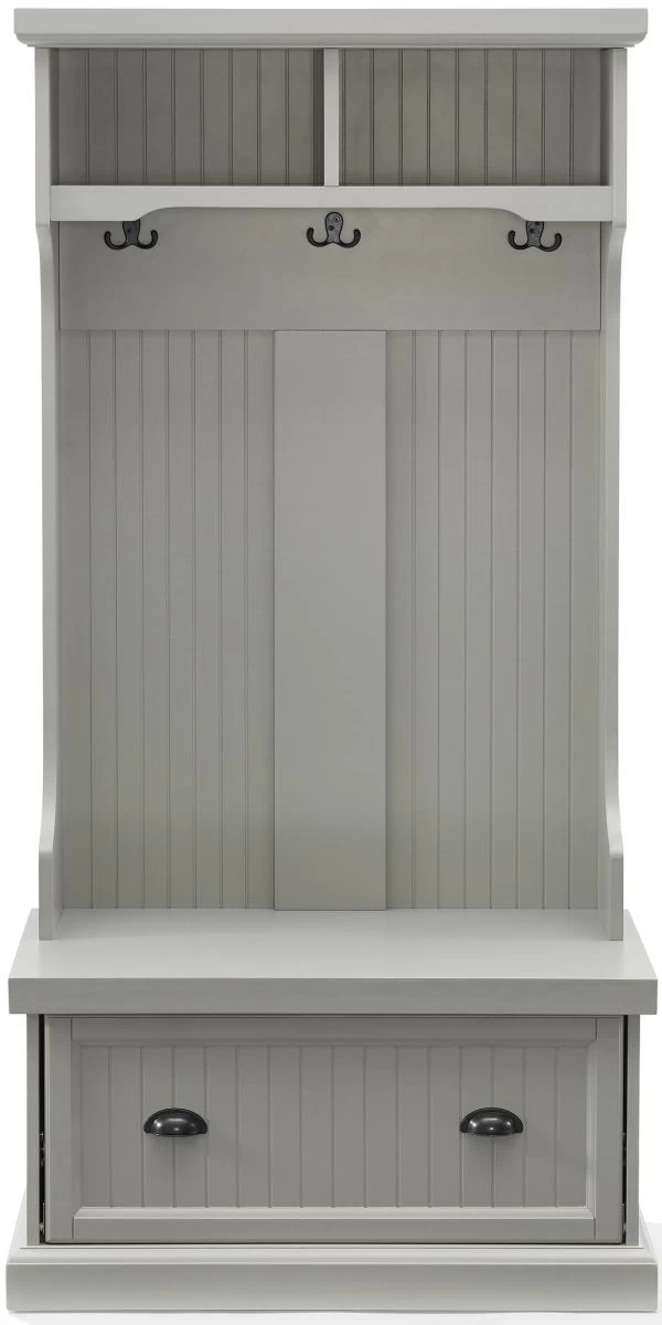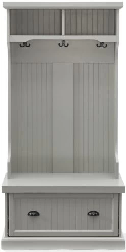 The three double prong hooks provide hanging storage for coats and book bags, while the two open shelves at the top can hold smaller items like your wallet and keys. Keep your home’s entrance clutter-free with the Shoreline hall tree.