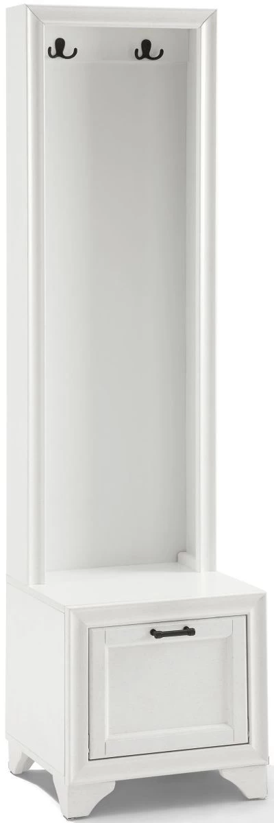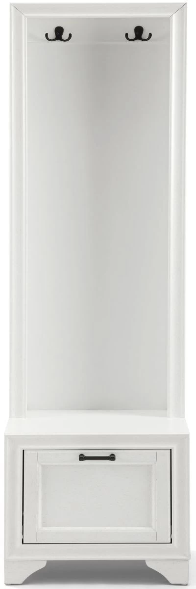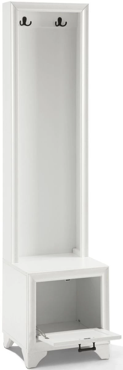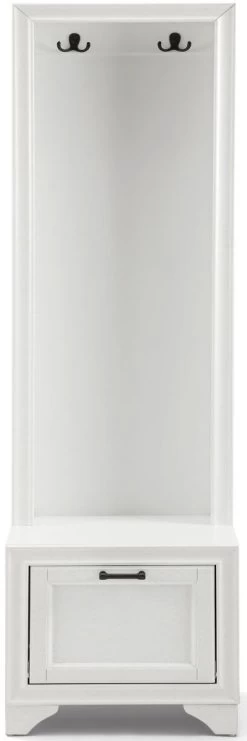 A spacious lower compartment has a hinged fold-down door with magnetic closure just right for storing shoes at the end of the day. The lower cabinet also creates a seating area or landing zone, making the Tara hall tree your go-to for home organization.