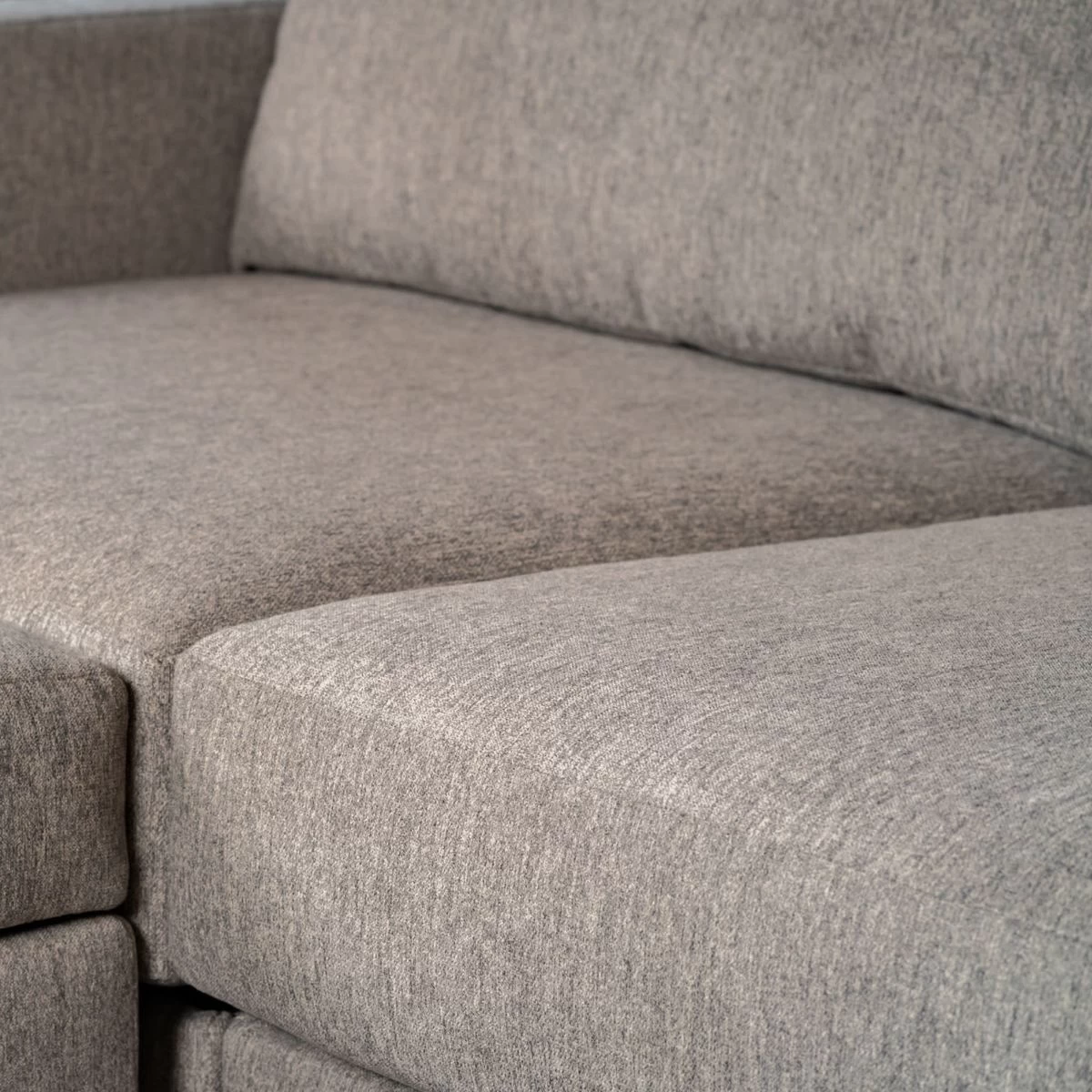 Upholstered in a gray performance fabric that is sustainably made with recycled water bottles and delivers exceptional stain- and water-resistance for easy cleanability, making it the perfect choice for active families and pets
