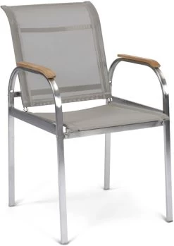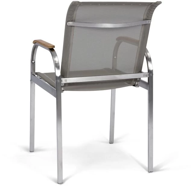 Lounge outdoors in comfort and style with the Aruba dining chair. This chair features a weather-resistant polished stainless steel frame, and the solid teak arm pads are finished with natural linseed oil to be water-resistant. Each chair features a contemporary sling style seat and back that is built to withstand the elements. The lower and upper back frame supports add both stability and comfort.