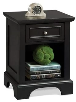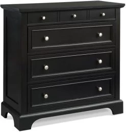 homestyles Queen Bed, two Nightstands, and Chest are constructed of hardwoods and engineered wood in a rich multi-step ebony finish. Bed Features include raised panels on the headboard and footboard. Item includes Queen Headboard, footboard, and rails. Item Size: 65 in. W x 67.5 in. D x 52 in. H Nightstand features include a storage drawer that measures 10.75 in. W x 10.75 in. D x 4 in. H, and open storage area that measures 12 in. W x 14 in. D x 11.5 in. H. Item measures 18 in. W x 16 in. D x 24 in. H. Chest features include four large drawers. The top drawer measures 28 in. W x 13 in. D x 2 in. H the remaining drawers measure 28 in. W x 13 in. D x 6.5 in. H. Item measures 36 in. W x 16.5 in. D x 36 in. H.