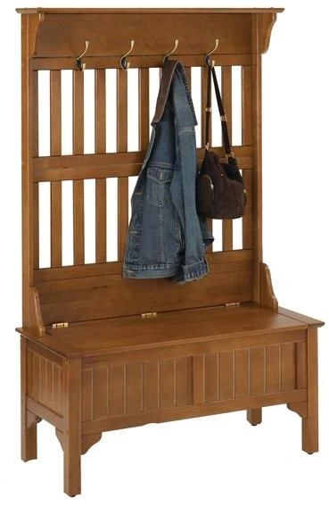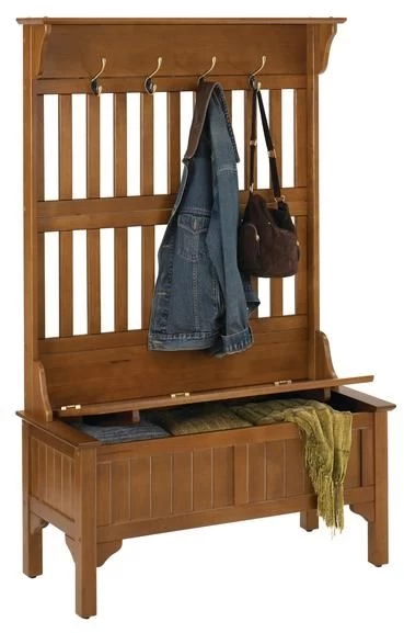 Practical and charming, the General Line Hall Tree with Bench by homestyles is constructed of Asian hardwood solids and wood veneers in a warm oak finish. Features curved accents with a slatted back panel that evokes mission style. The bench has a raised panel front design with tapered square legs. There are four brass coat hooks, a top shelf for hats, and a bench that opens to reveal additional storage for shoes and accessories. The bench lid has safety hinges, allowing it to hold in the open position and protect your fingers. Great accent for the front hall or foyer. Comes carefully packaged with all items labeled and coordinating easy-to-follow assembly directions.