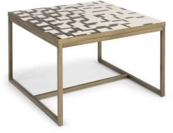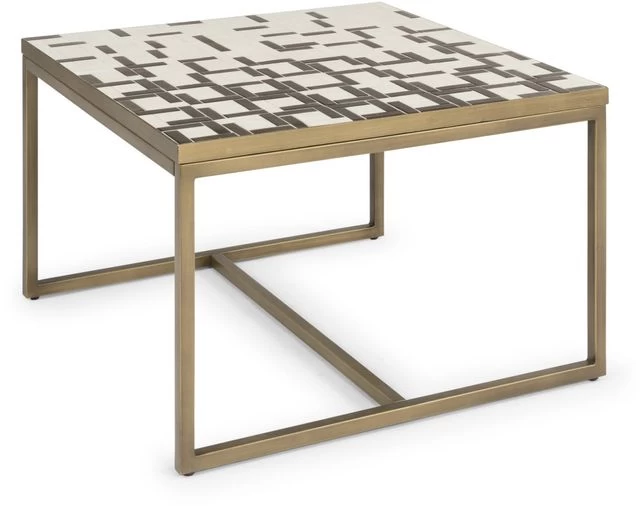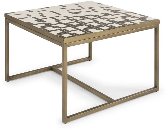 Contemporary mosaic tile top with open metal base, finish in brushed brass powder coated paint finish. This table can be used both indoor or outdoor. The top is a hand applied random pattern of cream and metallic gold tiles. The metal tube frame is supported by a center stretcher which adds stability to the table. Note finish and measurements may vary slightly. Assembly required. Arrives to your door by parcel delivery service.
