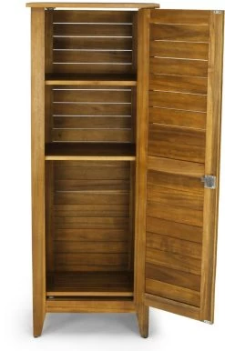 Whether stowing away outdoor supplies or poolside necessities, tuck everything neatly away in a Maho storage cabinet that brings an island flair to your outdoor areas. This solid acacia cabinet is highlighted by a golden teak finish and sealed with linseed oil that brings out the natural beauty of the wood. Three adjustable shelves let you customize the space to your needs, even if that means removing all the shelves to store yard tools, pool noodles, or other long items.