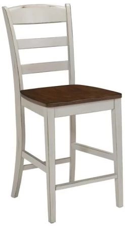 The homestyles Monarch Counter Bar Stool provides a fun, shabby chic style and comfort you can rely on. The beautiful multistep antique distressed white finish and sanded edges complements the distressed warm oak seat. Features a protective clear coat. Whether using it as a bar or counter stool, it makes a sleek, eye-catching addition to your home. The straight, vertical back design provides traditional style, while the smooth surface of the oak seat creates comfortable support. This counter stool also boasts four square legs with a slight curve for added flair. A clear plastic button on the bottom of each leg protects your floor from any markings. Comes carefully packaged with all items labeled and easy-to-follow assembly directions.