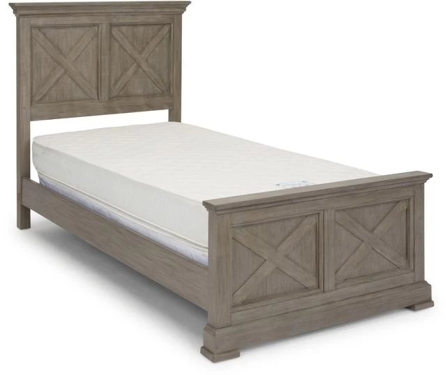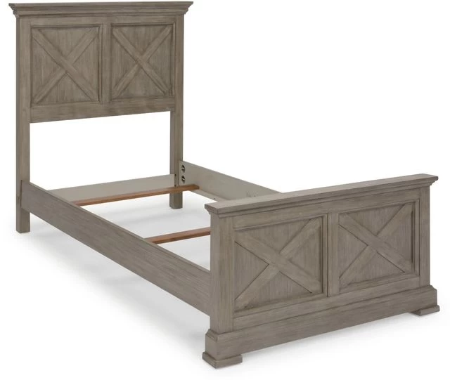 Rustic casual design that is at home in a mountain lodge, as it is in a mid-town loft. Crafted of mahogany solids and veneers with engineered woods, that features solid wood “X” frame design, with inset wainscot panels, with all surfaces wired brushed to provide a rough-hewn look. Finished in a multi-colored gray that provides unique high lighting to the design. Headboard and Footboard both feature large shaped solid wood molded tops. Footboard has solid wood molded base with block feet. Includes 6- inch side rails with slats. Arrives to your door by parcel delivery service. Note finish and measurements may vary, assembly required.