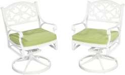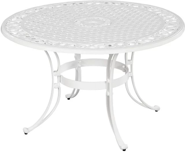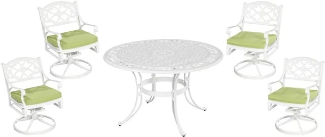 The difference between an average backyard and an open air sanctuary is found the classic comfort and traditional style that Sanibel delivers. This 5-piece dining set includes a round table and four swivel chairs with cushions, all made of cast aluminum with a powder-coated finish and a clear coat that offers total protection from the elements. The table top and seat design allows water to quickly drain through to prevent pooling or staining. The center umbrella hole includes a cap to cover it when not in use.