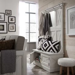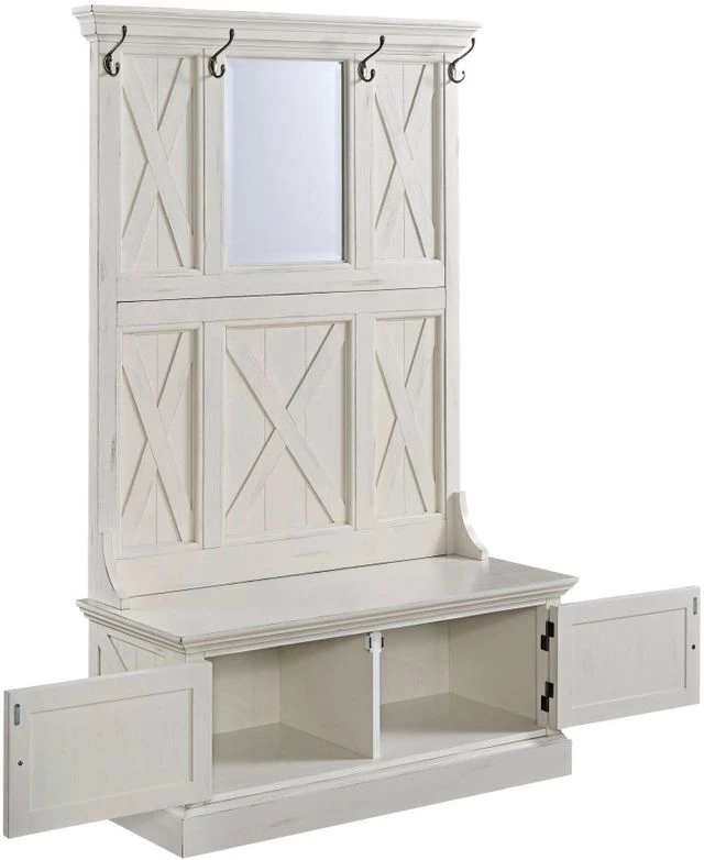 Rustic weathered wood and a signature X-frame mark the cottage feel of the Seaside Lodge Hall Tree by homestyles. Crafted of wire-brushed wainscot inset basswood veneer panels and a solid poplar frame in a hand-rubbed white finish. There is a full-size bench with two lower doors that open to individual storage areas behind each. The doors feature antique nickel-finished hardware. The top panel of the hall tree boasts a large beveled glass mirror and four large hooks for coats, bags and more. A charming addition to the front entryway or mudroom.