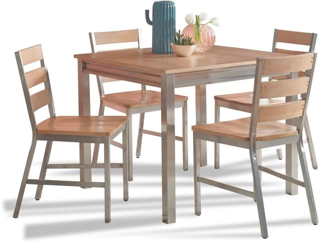 Casual dining with lasting style. The Sheffield 5-Piece Dining Set by homestyles features a dining table and four chairs. The table has a rubber wood veneer tabletop with the strength and durability of a stainless steel frame and legs. The dining chairs have a shaped, solid rubber wood seat and shaped back slats of rubber wood veneer over plywood. All pieces have a natural whitewashed finish.