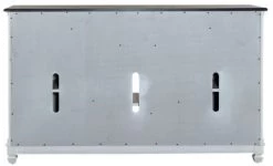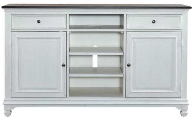 This console has full extension drawer glides for easy access to storage, antiqued pewter knob hardware, fully stained interior drawers, square tapered feet, and 4 adjustable shelves. The open compartment and wire management provisions effortlessly accommodate electronics or gaming equipment.