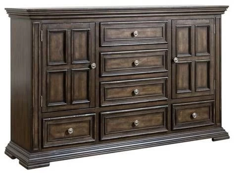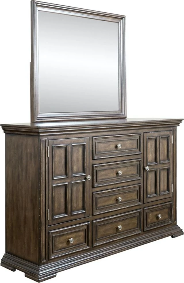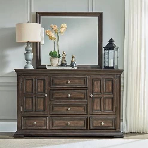 A graduated bead molding creating architectural interest, square pilasters and block feet, full extension drawers with premium felt lined top and cedar lined bottom drawers, and is accented with antique pewter knob hardware. The dresser has six drawers and two doors, with an adjustable shelf behind each door. The beveled edge mirror can be attached to the dresser using the included bolt-on supports. Warm antique finishes and artistic distressing along with grand scale makes the Big Valley a group to be passed on to generations.