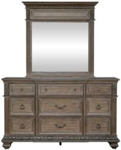 There are nine full extension drawers for optimal storage. The drawer fronts are wood framed and feature bead molding for added dimension and are accented with Antique Brass knob, drop ring, and bail hardware. The top drawers are felt lined, and the bottom drawers are lined with cedar. The mirror offers a wide landscape view and features carved corbels and fluted pilasters. The top crown of the mirror displays acanthus leaf carvings. The 1” beveled edge adds an additional elegant touch. Attach this mirror to the Carlisle Court nine drawer dresser with the included bolt-on supports. Combine the grand feel of the past with today’s luxurious lifestyle with the Carlisle Court dresser and mirror.