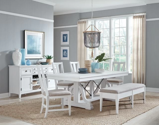 Boasting timeless design influences and impeccably crafted functionality, the dining furniture in Heron Cove is second to none. Its fresh cottage-inspired look is equally suited for casual dinners or entertaining a crowd. Youāll love the easygoing design versatility of Heron Coveās Chalk White finish and Aged Pewter accents. This classic collection offers raised beaded trim, framed-panel elements and straight, shaker-inspired legs. Go bright or neutral with your table linens, they all work wonderfully with this versatile collection that can be styled to feel coastal, cottage, farmhouse or traditional. Finish: Chalk White, Aged Pewter Metal, Baja Fog Fabric Materials: Thick Pine Veneer, Pine Solids, Metal, Fabric Hardware: Aged Pewter D4400-25 table can be extended to 90″x38″x30″ with 1 center removable ext. leaf (18″/pc). metal guide. metal decoration on base.