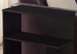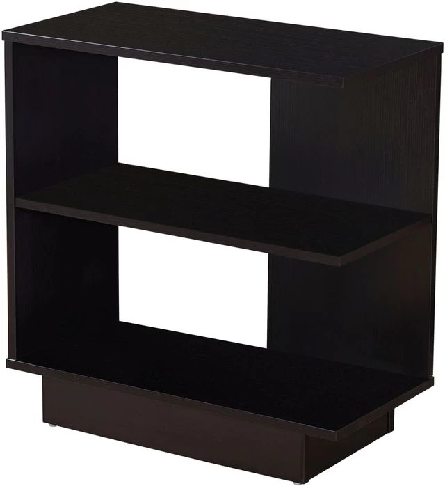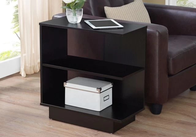 This simple rectangular side table with open storage shelving in a contemporary design brings style and function to any room. It starts with a smooth laminated cappuccino finish on all sides on a sturdy elevated base. The spacious tabletop can hold a small lamp, place your drink or set down your tablet or book. The two open shelves with a partial back panel are perfect to store books, magazines, or gaming consoles. So versatile, this accent table can also be placed in a bedroom as a nightstand as well as a side or end table in your living room or family room. Assembly is required.