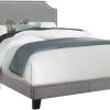 Low profile twin bed frame upholstered in a beautiful grey linen look fabric; padded headboard boasts an elegant tufted design