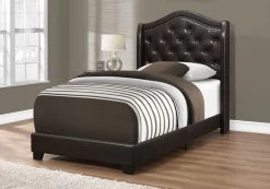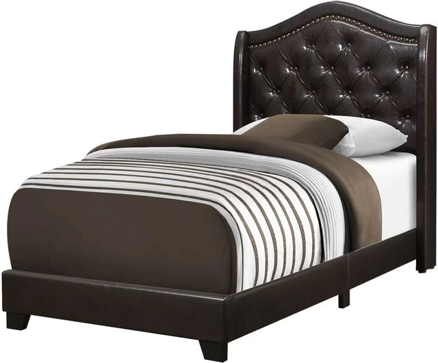 Give your bedroom a master appearance with this luxurious twin size bed frame and wing back headboard, upholstered in a sophisticated brown leather-look fabric. The gently curved classic style of this floor length headboard, outlined with a brass nail head trim and cushioned diamond tufting, gives the bed a statement making flair. The clean lines of the upholstered sides and front frame brings a contemporary touch; the black solid wood legs, slightly angled at the front, adds stability to the whole bed frame. The box spring and mattress is not included and must be purchased separately. All parts and assembly instructions are included.