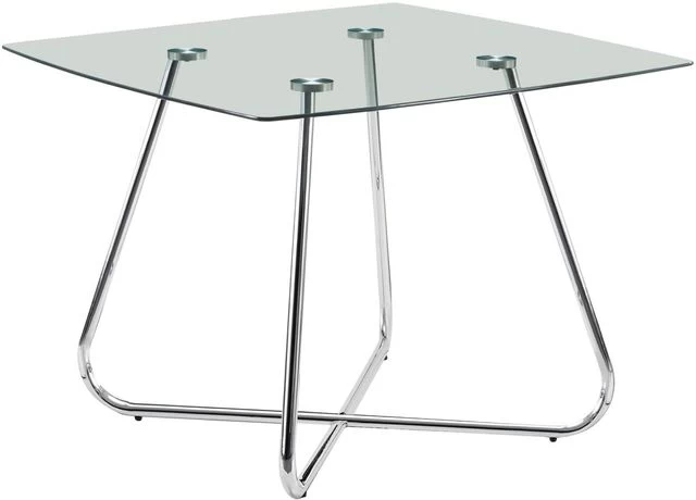 Make meal time more interesting with the chic look of this contemporary styled dining table. The clear tempered glass top will help keep your dining space open and light, while the silver chrome metal tubular base adds a modern touch that will keep you dining in style. Featuring smooth rounded edges from top to bottom, this table can easily be paired with your choice of chairs and is ideal for smaller spaces, lofts, dining room, or eat in kitchens.