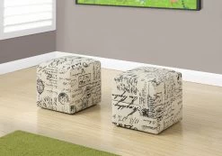 Give your little ones a comfy place to sit and rest their feet with this fun sized 2 piece juvenile ottoman set. Upholstered in a vintage inspired off white/black French script printed cotton-linen material, this set will take tea time to a whole new level! Perfect for a reading corner, these ottomans provide extra seating while adding a classic touch to any bedroom or playroom. Comfortably padded and built to last, these ottomans are a must have for any child.