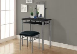 This classy 2-piece vanity set will be a fabulous addition to your bedroom or dressing area. Create a peaceful space to get ready for your day, or for a fun night out. This vanity set features smooth lines, silver metal legs, a vertical swivel mirror, and a shelf to keep brushes, make-up or other accessories. The rich black finished top and the matching stool, with comfortably cushioned microfiber seat, will add sophistication to any room.