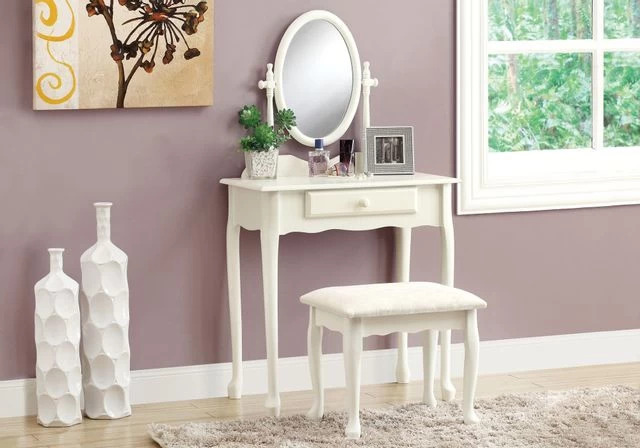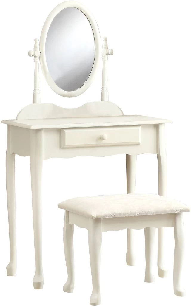 This elegant, two-piece vanity set will be the perfect addition to your traditional master bedroom or dressing area. Create a peaceful space to get ready for your day, or a great place to accessorize before a fun night out. This set features a dainty apron and cabriole legs in an antique white finish. The oval swivel mirror and a storage drawer accented with a simple white wooden know, is ideal for keeping brushes and accessories organized. The stool matches with the same elegant cabriole legs with a tone on tone white floral fabric covered seat for a regal look and feel that will add sophistication to any room.