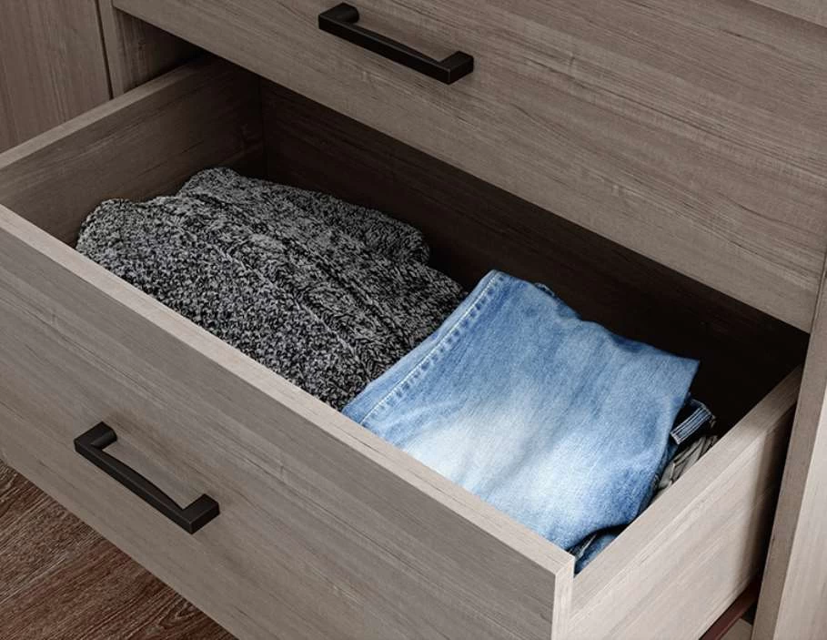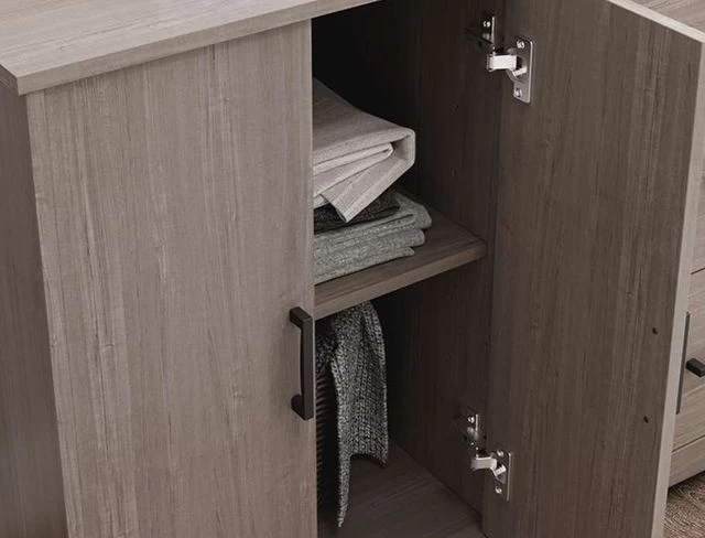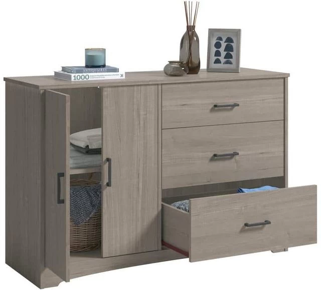 This dresser with drawers has a simple design but does not mean it is boring. This wood dresser allows you to store your favorite items with efficiency and taste as it offers three easy glide, spacious drawers that sit on metal runners. Hidden storage behind vertical doors with an adjustable shelf accommodates items of multiple heights. A wall anchor strap as a safety measure is included as Sauder values the safety of you and your family members. Finished in a cool toned Silver Sycamore™, the Beginnings® dresser with doors and drawers fits nicely with other Sauder products as well as the furniture already in your home. Store your family’s clothes and accessories with care and style. This bedroom dresser offers classic design which makes it perfect, and safe, for a children’s bedroom as well as a master suite.