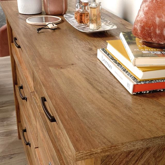A beautiful dresser makes the perfect finishing touch to any bedroom. Add stunning style while creating versatile storage options with this dresser from the Cannery Bridge collection. This bedroom dresser features six large drawers that open and close on smooth metal runners for easy access storage of an array of different items like stacks of jeans and your favorite blouses to comfy sweatshirts and your collection of cozy socks. It has a place for all your things! This six drawer dresser also features a spacious top surface that provides you with an additional place to store bedroom items and display home décor like an accent lamp, your perfume bottles, pictures of your family and your makeup bag too. The side panels of this dresser feature a unique herringbone pattern that adds an extra touch of detail to your bedroom. Finished in Sindoori Mango and accented with attractive hardware, this handsome dresser is just what your bedroom is missing.