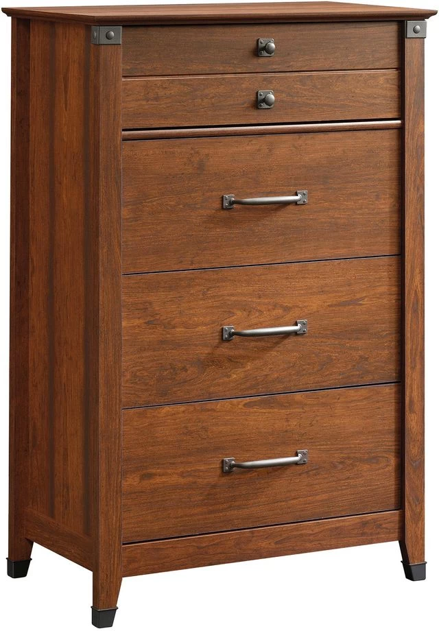 Is your shopping addiction getting out of hand, leaving you with too many clothes and not enough space? Don’t fret, we have the solution for you. Check out this chest of drawers from the Carson Forge collection. It features four deep drawers that open and close on smooth metal runners with safety stops – they have room for all your stuff! Finished in Washington Cherry and paired with wrought iron style hardware and accents, this dresser is not only functional, but stylish too.