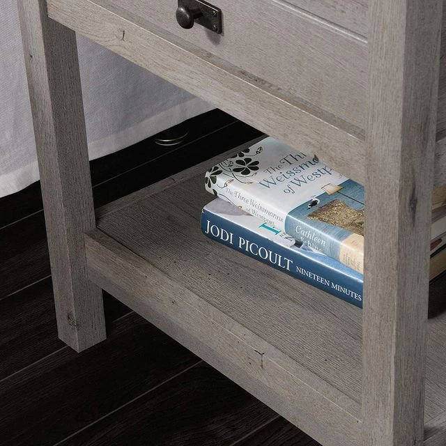 No bedroom is complete without a stylish night stand. Add a touch of charming design and beauty to your favorite room to snooze in with this night stand from the Cottage Road collection. Its spacious top surface provides you with the ideal amount of space for all your bedside necessities like your alarm clock, a lamp, your smart phone and a refreshing cup of ice-cold water too. It also features a storage drawer that opens and closes on smooth metal runners for easy access storage of items like tissues, your reading glasses and the TV remote. Its lower open shelf provides you with additional storage space for stacks of books and organizing bins. It’s finished on all sides for versatile placement throughout any room in your home – next to your bed or cozied up next to the couch in the living room. It looks great no matter where it stands! Finished in Mystic Oak and detailed with attractive hardware, this stunning end table is everything you need and more.