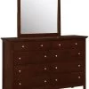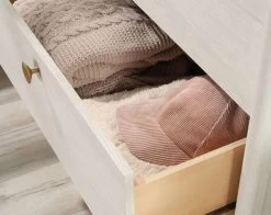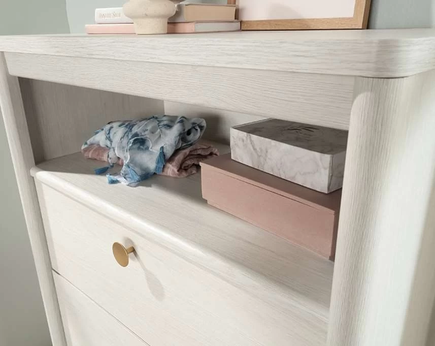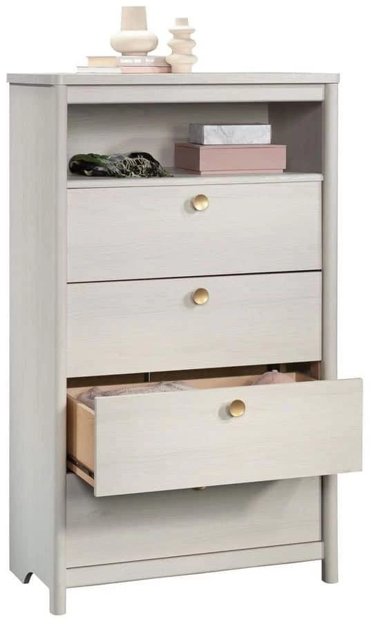 This dresser with open shelf features four spacious drawers that open and close on smooth metal runners and feature safety stops for easy access storage of items like stacks of slacks and your favorite blouses to comfy sweatpants and your collection of t-shirts. This 4-drawer chest features a small open shelf that provides additional storage for jewelry, your journal, or any other small items you need to keep close. The top surface of this dresser with drawers can be used for your perfume, makeup mirror, or an accent lamp. This bedroom dresser is designed with a T-lock drawer system for quick and easy assembly. Finished in Glacier Oak™, use this 4-drawer chest to liven up the master bedroom or guest room with storage and style.