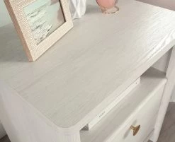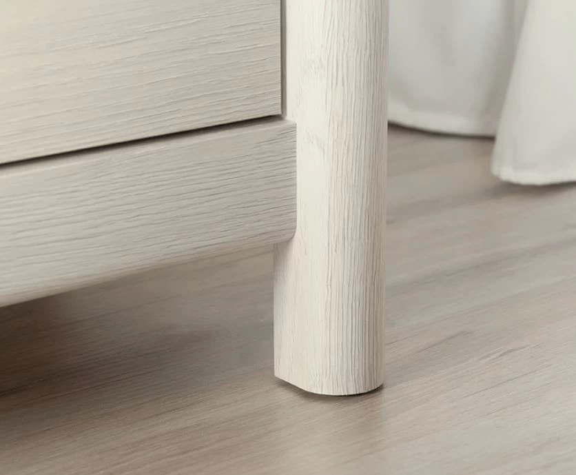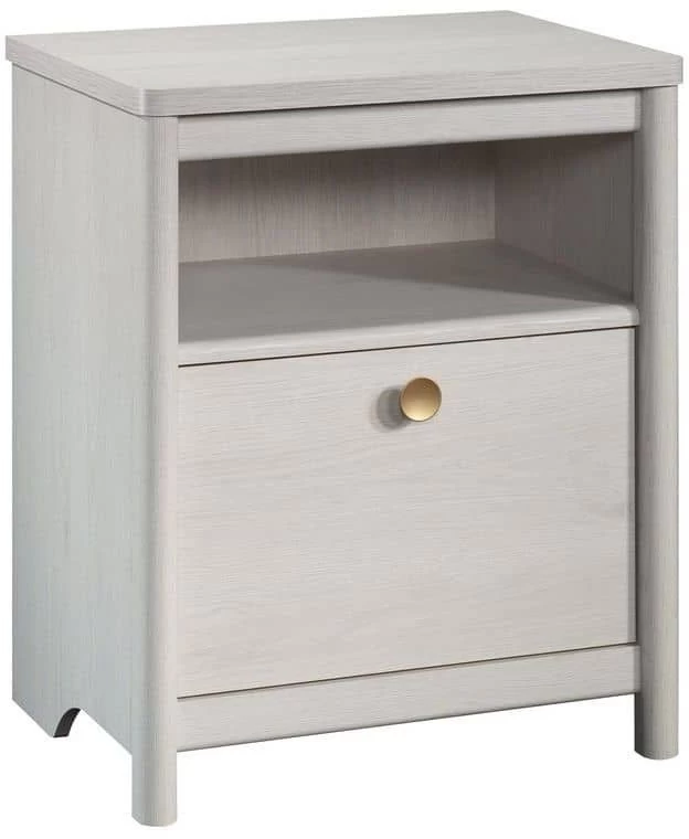 This bedroom night stand offers a spacious top surface with room to set items like an alarm clock, accent lamp, your smart phone, and a glass of water. The open shelf of this bedside table provides easy access storage for items like the TV remote, reading glasses, and your favorite book. Plus, the lower drawer with metal runners and safety stops provides a hidden space to stow away items you prefer to keep out of sight. This night stand with shelf is finished on all sides for versatile placement. It will look polished from all angles. Finished in Glacier Oak™, this small bedside table with drawer will complete the look of your bedroom décor.