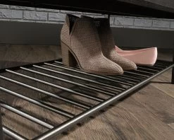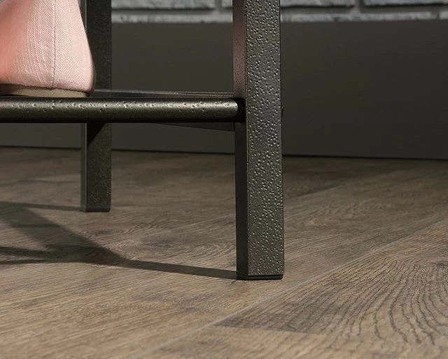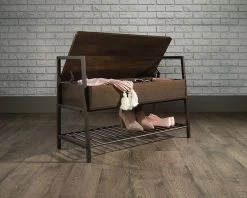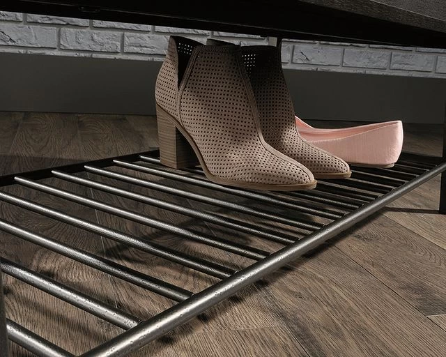Take a seat and rest your feet – or just slip on your shoes. Create a convenient seating option while adding versatile storage to your home with this storage bench from the North Avenue collection. This handy bench features a spacious seat that creates the perfect entryway spot to tie your shoes in the morning, kick your boots off at night or for an extra spot for your guests. The seat flips up to reveal a hidden storage area that includes a divider for you to organize and store anything from books and blankets to jackets and handbags. It has room for all your miscellaneous items. It also features a lid stay for safety. The lower grate-styled shelf provides you with additional storage space that is ideal for shoes or easy-access storage for just about anything. Its simple design and industrial charm make this bench a great fit in any room of your home. Finished on all sides in Smoked Oak and paired with a durable, black metal frame, this one-of-a-kind storage bench is just what you’ve been looking for.