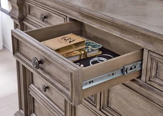 French/English drawer construction with fully finished interiors and metal ball bearing side glides