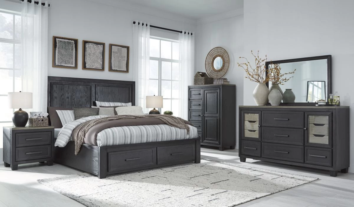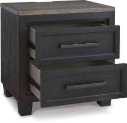 The cases feature several unique pieces with lots of storage options. All drawers feature dovetail construction, fully finished drawer interiors with felt bottoms in the top drawers and soft-close drawer glides. B989-92 two drawer nightstand includes a 110V power supply with dual USB charging ports.