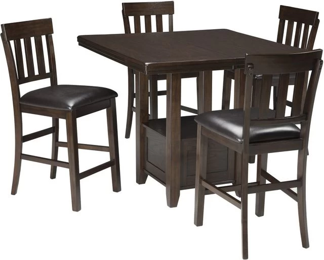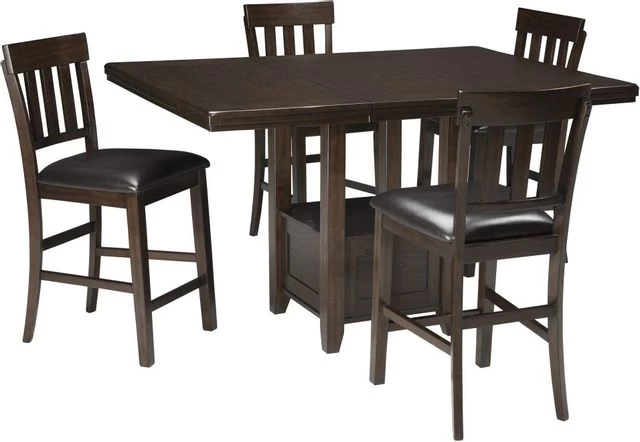 Enjoy family-style feasts on the Haddigan 5-piece table set, complete with 4 bar-height stools with rake-back design and faux-leather upholstery over foam cushioning. The counter-height table features a separate extension leaf to seat up to 6.
