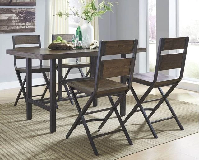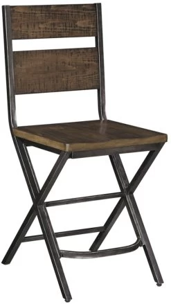 Made with select pine veneers and hardwood solids in a medium brown reclaimed look finish with saw kerf detailing. Metal and wood combination with crisscross leg design with shaped foot rest. Wood chair seat and bench design has seat scoop for comfort and wide slat ladder back look. Contoured seats and adjustable levelers for a comfortable dining experience. Tables have square stock legs with detailed stretcher. Metal finished in a dark metallic toned brush effect with some nail head detailing.